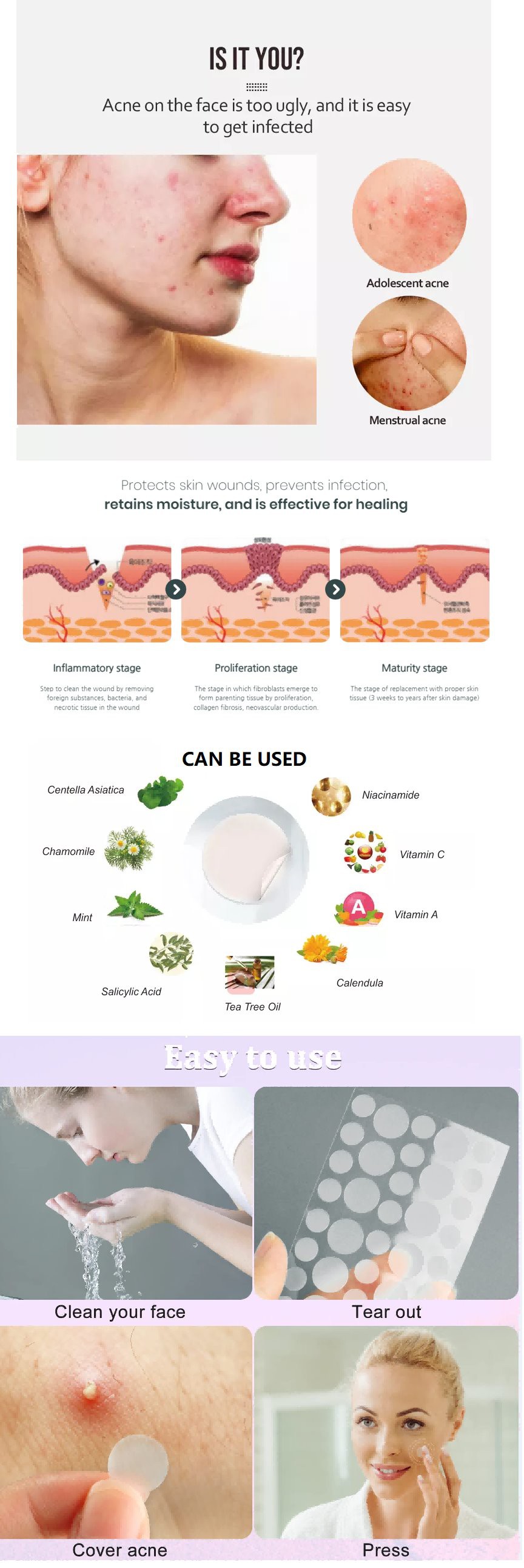 Pimple Master Patch on erityinen hydrofiilinen hydrokolloidi pääraaka-aineena. Tämä raaka-ainetahna akneen voi imeä eritteitä ja auttaa tasoittamaan aknea. Ja voi vähentää bakteeri-infektion mahdollisuutta, sopii paremmin tulehtuneeseen akneen.
